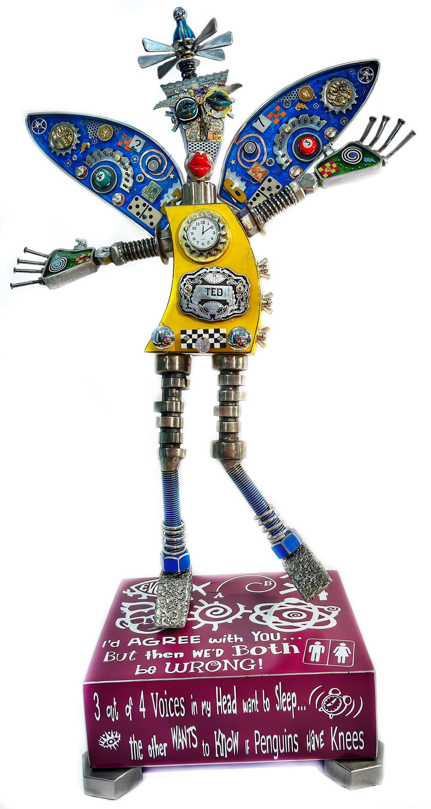 Dave Tuttle has been creating crazy, zany robots for months, in anticipation of his December exhibit at Butterfield. Robots with wings, propellers and more. He draws on a supply of metal which he’s collected over the years from machine shops, warehouses and individuals. His metal work is often infused with mixed media materials such as epoxy resin, polymer clay, alcohol ink, rivets and wire, to name just a few. The heart is a common motif. As a secular humanist, he strives to convey compassion, tolerance and empathy through his work.