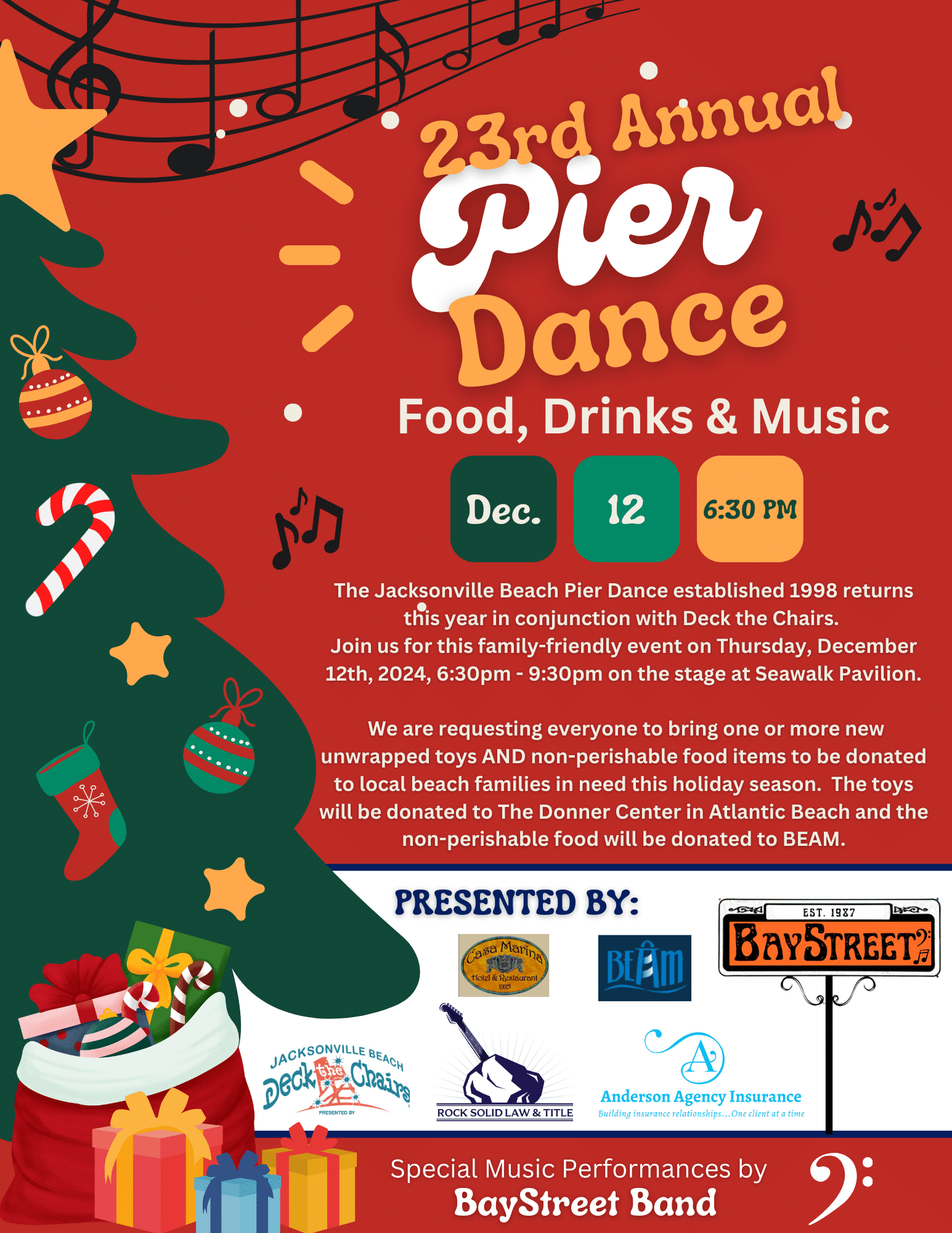 A cherished Beaches holiday tradition is back! The 23rd Annual Jacksonville Beach Pier Dance, sponsored by Casa Marina and Anderson Agency Insurance, will take place on Thursday, December 12th, 2024, from 6:30 PM to 9:30 PM at the Seawalk Pavilion stage. This year’s event, featuring the beloved BayStreet Band, invites the community to come together for a night of music, dancing, and giving back.