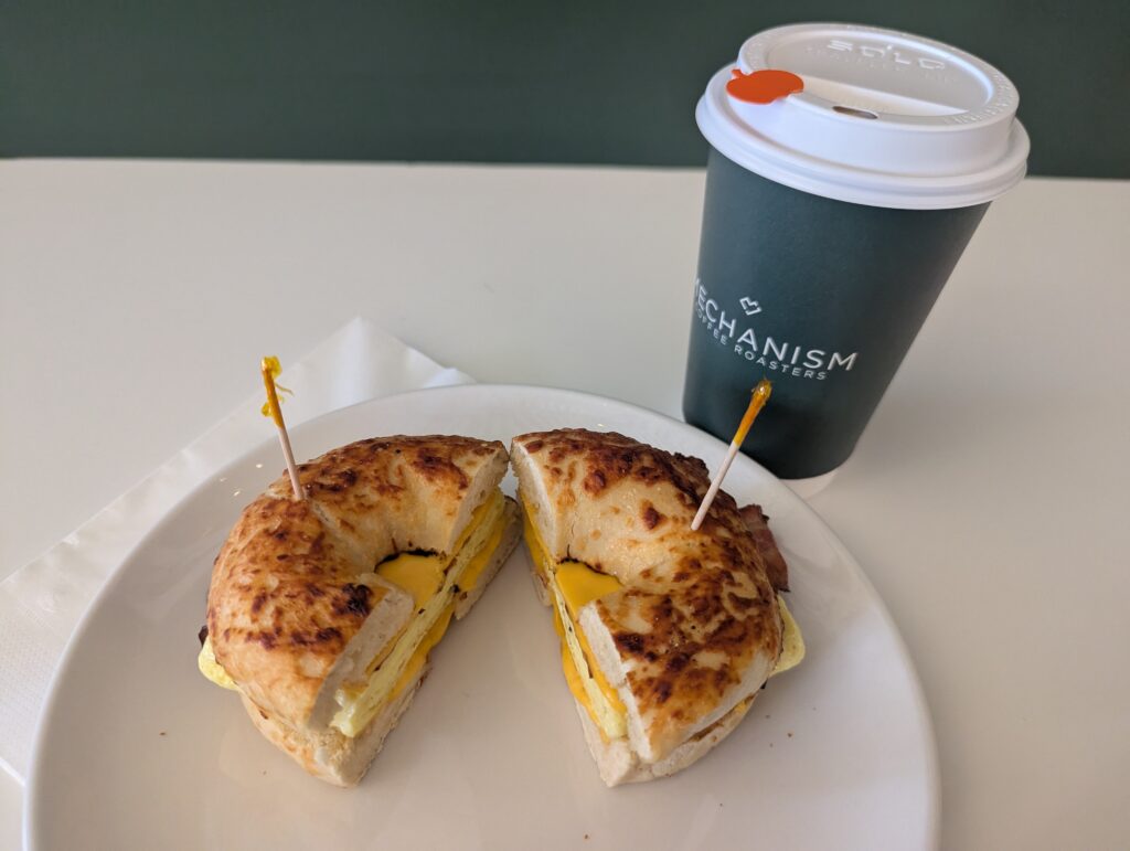 The food and drink I decided to get were the bacon, egg, and cheese bagel, and a mocha with caramel latte. They have several bagel options for their bagel sandwiches, so I chose an asiago bagel to see how well it’d complement the cheese, and I wasn’t disappointed. It was all cooked very well together, and surprisingly easy to chew. Normally for me, bagel sandwiches are either really hard to bite through or really messy, but this sandwich was neither of those things! Soft and held together extremely well, it makes me think the chefs at Mechanism are secret wizards who have mastered the bagel arts. All of the flavors also went very well together, with not one thing overpowering the other. The bacon was savory, the cheese added that smooth and creamy texture, and an egg always ties things together in a nice little bow. The mocha caramel latte was the right mixture of sauce and syrup – it wasn’t too chocolatey to overpower the caramel, which is exactly what I hope for in my go-to drink. Of course, it was sweet, but the coffee also showed through quite well, making it another perfect balance in a cute cup. It was also incredibly smooth, which proves how good the coffee and the barista making it are.