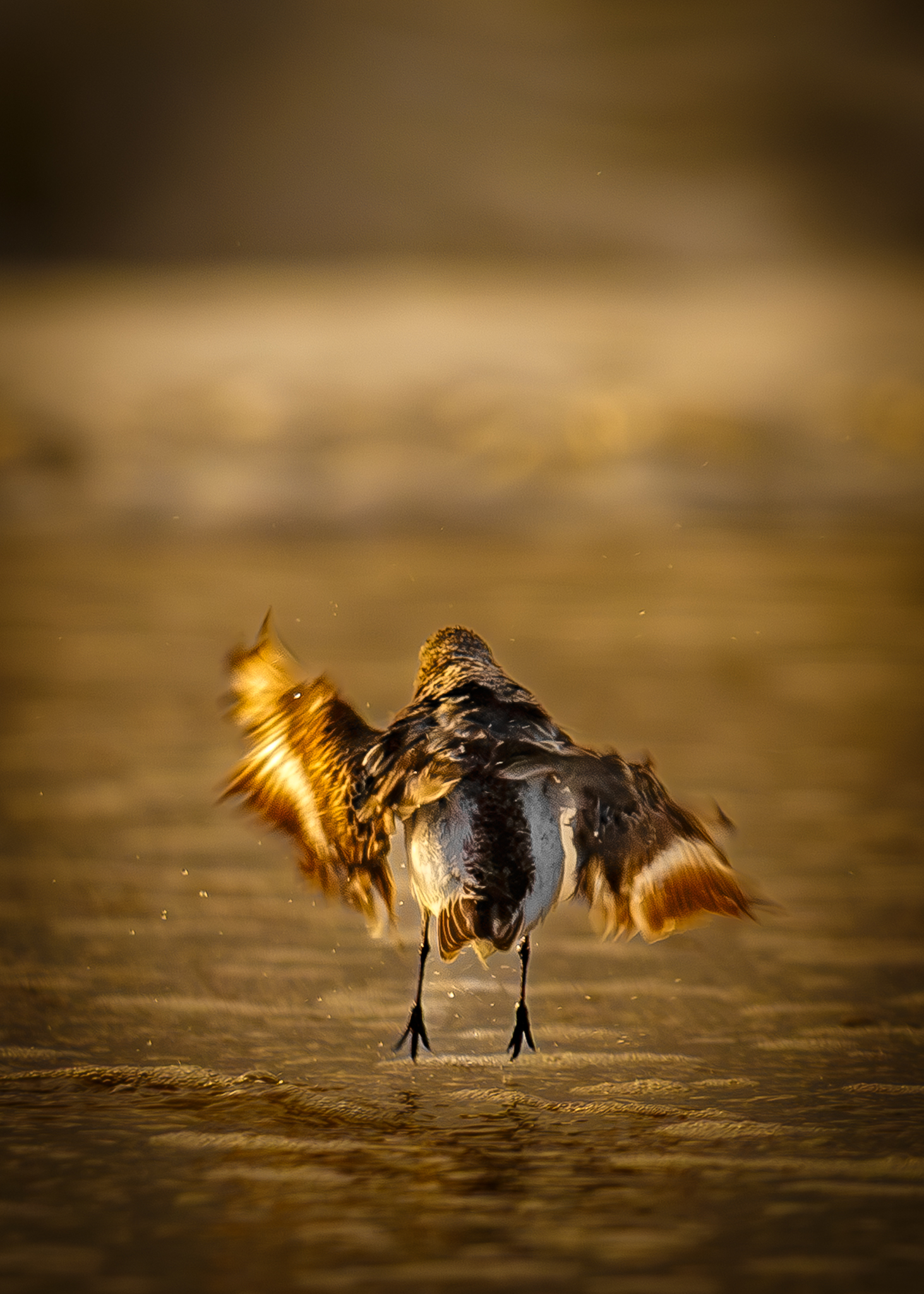 A small shorebird, shakes its feathers dry after a dip in the surf on Ponte Vedra Beach. The soft, golden light of the sun illuminates its wings in a beautiful blur of motion, highlighting the details of its plumage. The sandpiper’s presence is a gentle reminder of the diverse ecosystem supported by the state’s coastal habitats, and the quiet, natural beauty found along First Coast.