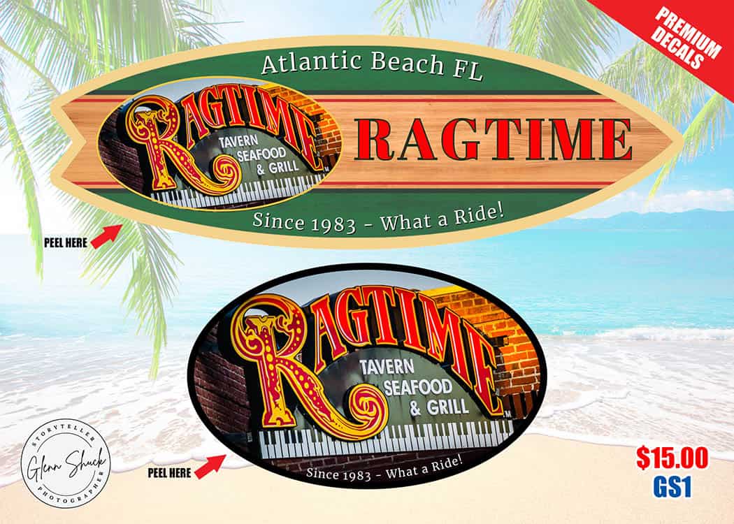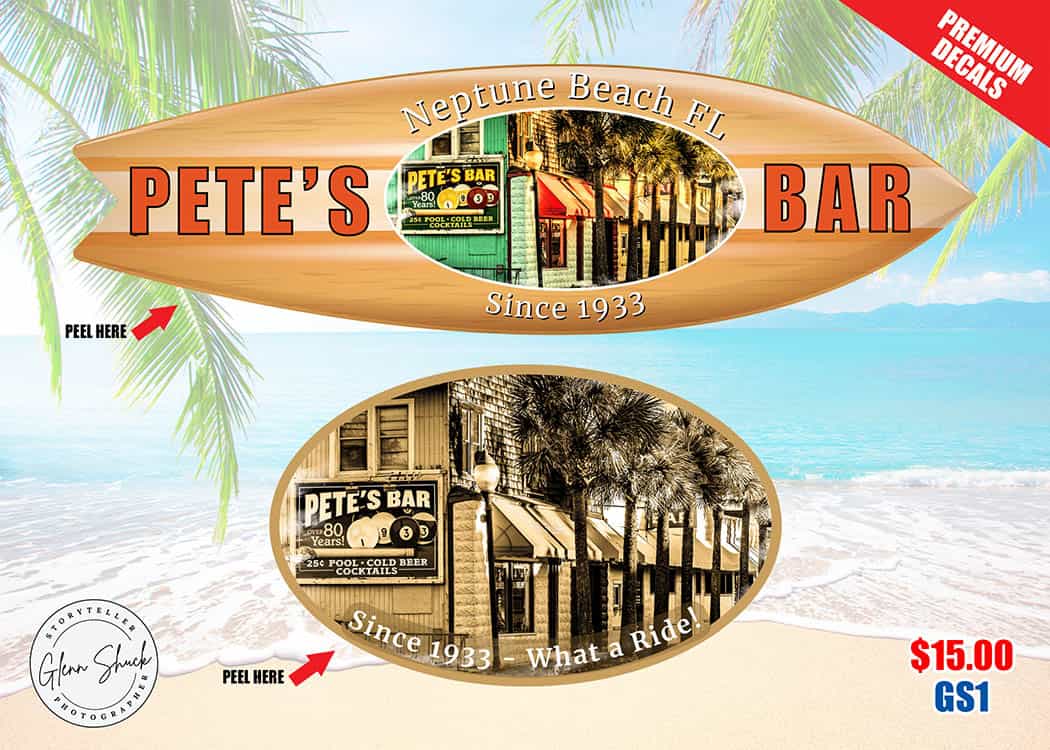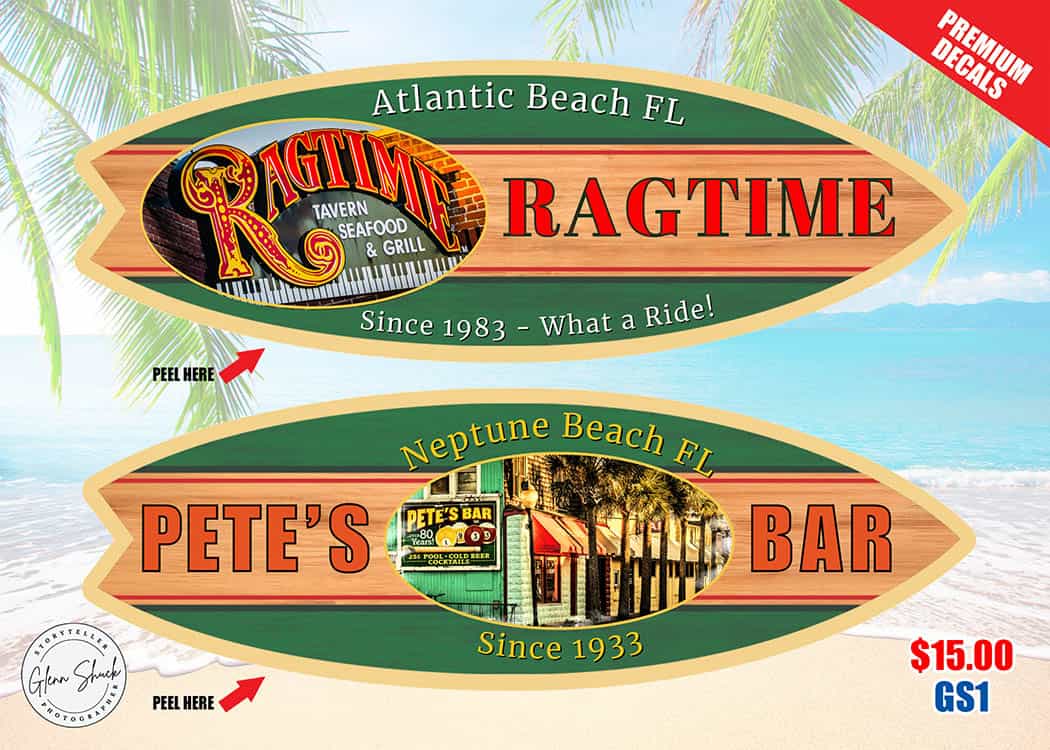 Celebrate two legendary First Coast institutions with these premium surfboard-shaped decals featuring authentic photography by Glenn Shuck. Each set includes 6 high-quality die-cut stickers showcasing the iconic storefronts of Pete’s Bar (est. 1933, Neptune Beach) and Ragtime Tavern Seafood & Grill (est. 1983, Atlantic Beach). These aren’t just stickers – they’re pieces of local history.