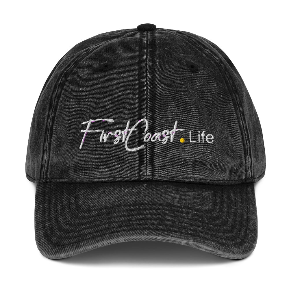 Classic meets coastal with this vintage-style cotton twill cap featuring embroidered “First Coast Life” lettering and a signature yellow accent. The premium twill fabric has that perfectly aged look straight out of the box, while the unstructured fit keeps things relaxed and comfortable. Whether you’re grabbing coffee on Atlantic or watching the sunset at the beach, this cap brings that effortless First Coast vibe.